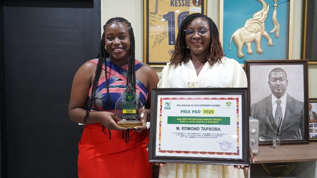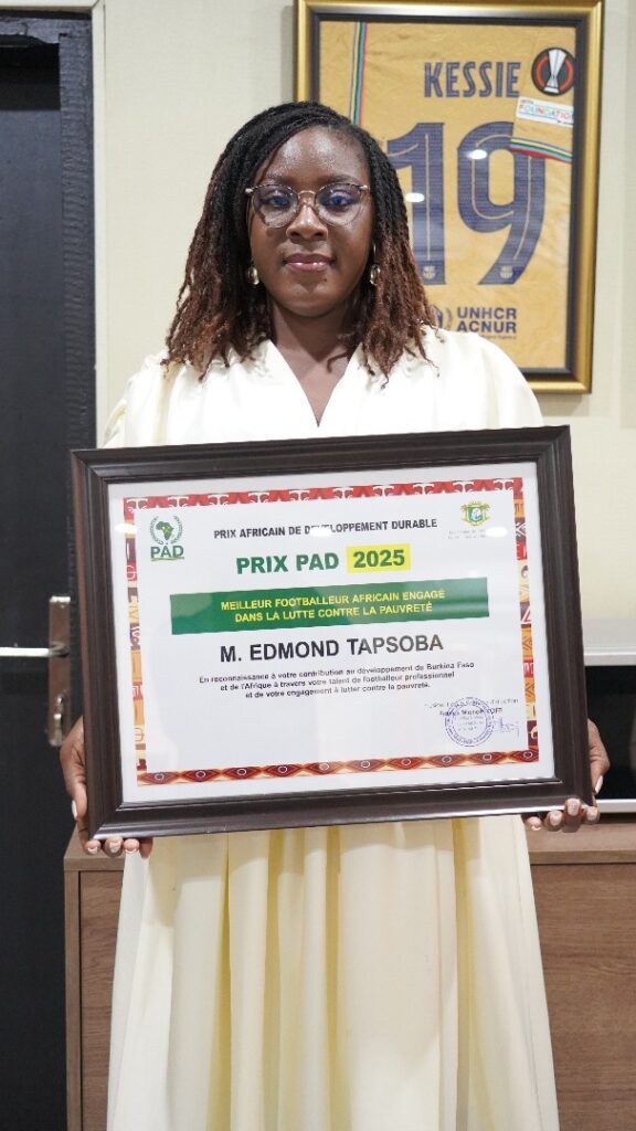 Sandrine Ouédraogo, Directrice Exécutive de la Fondation Edmond Tapsoba a réceptionné le samedi 26 juillet 2025, à Bingerville dans la banlieue abidjanaise, le Prix Africain de développement durable décerné à ladite Fondation de l’international footballeur burkinabè, Edmond Tapsoba.