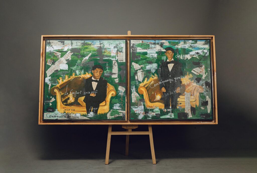« Mes créations, empreintes de symbolisme, incarnent les tensions entre les forces destructrices et celles qui élèvent l’être humain. Par des couleurs vibrantes et des formes brutes, je donne vie à des récits qui dénoncent les inégalités, tout en célébrant la résilience et l’espoir », confie-t-il.