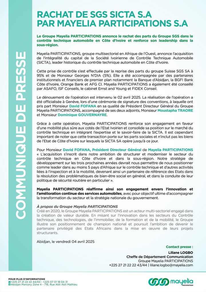 Mayelia PARTICIPATIONS, un acteur multisectoriel de premier plan en Afrique de l’Ouest, a finalisé cette transaction par la reprise des parts détenues par le groupe suisse SGS SA (95 %) et Monsieur Georges N’DIA (5 %). L’opération, officialisée le mercredi 2 avril 2025 lors d’une cérémonie à Genève, a bénéficié du soutien de partenaires institutionnels et financiers de renom, notamment la Banque d’Abidjan, la BGFI Bank Côte d’Ivoire, Orange Bank et AFG CI. Pour mener à bien cette acquisition, Mayelia PARTICIPATIONS a été conseillé par les cabinets ASAFO, ISF Conseils, Ernst and Young et FIDEX Conseil.