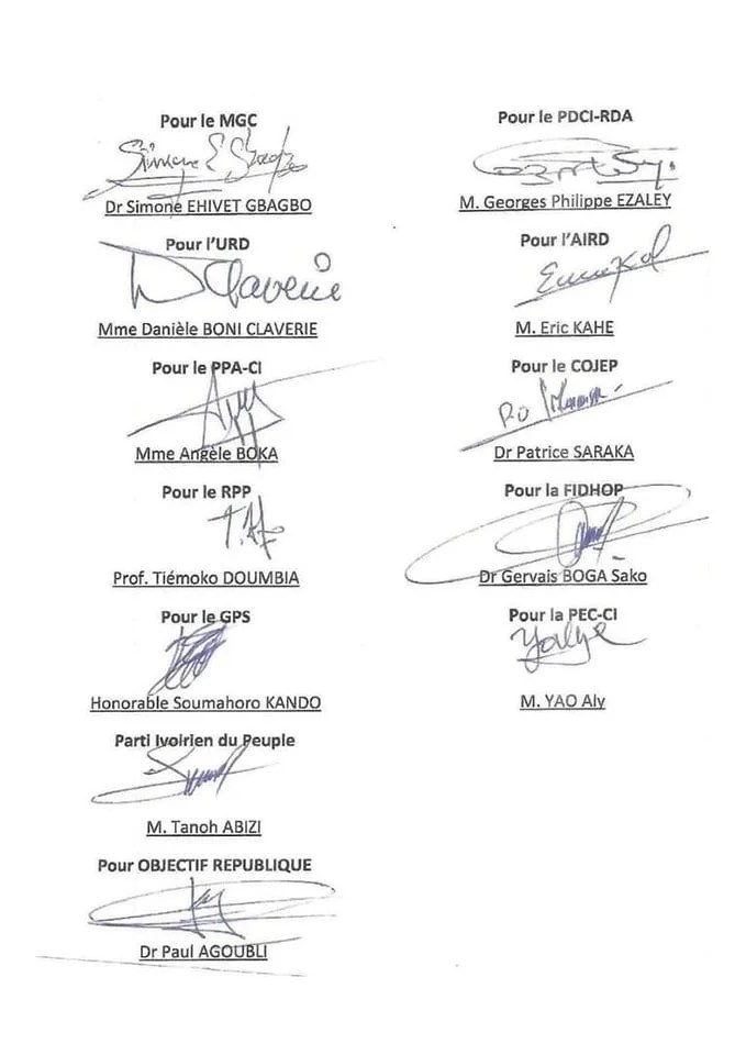 – onze (11) partis et mouvements politiques, à savoir le MGC, le PDCI, le PPA-CI, le COJEP, le GPS, l’URD, l’AIRD, le RPP, le PIP, Objectif République, le Renouveau Démocratique ;
