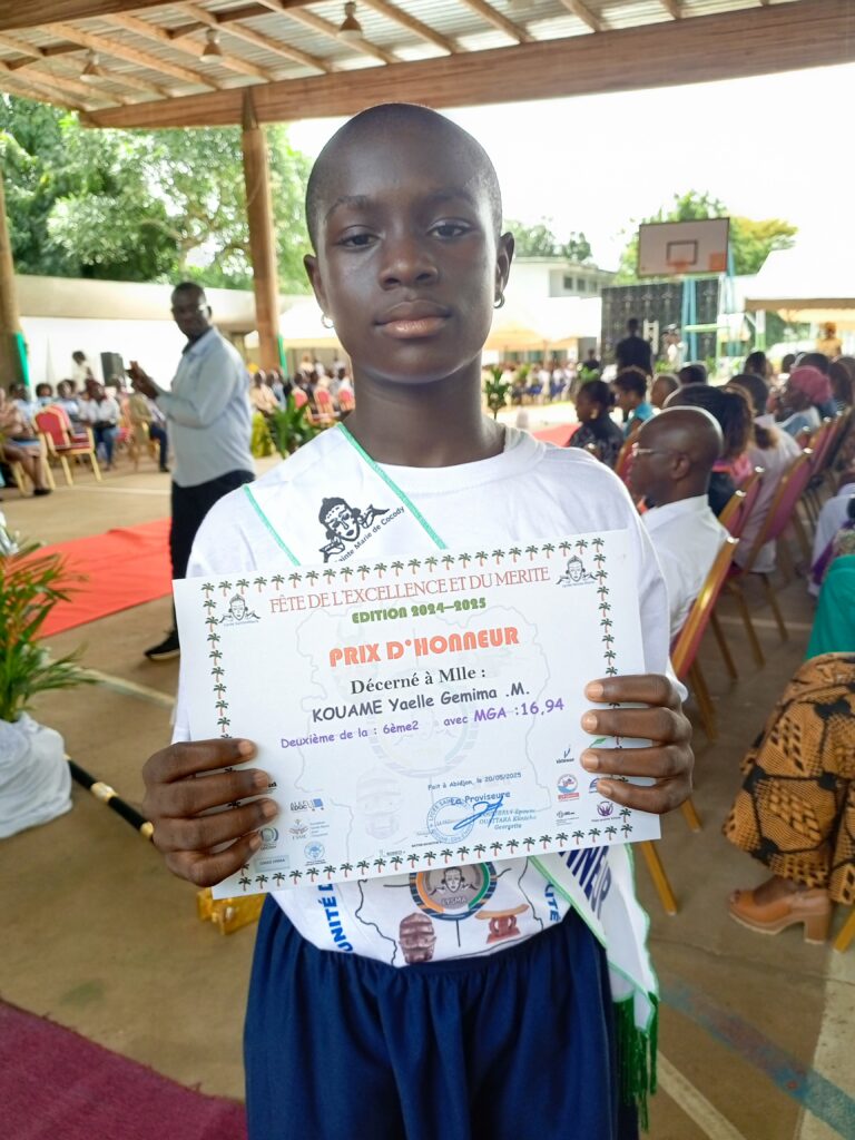 Le Prix Lycée Sainte-Marie est revenu à Diagne Cathy Malika (Terminale D), tandis que le Prix Odile Devasselot a honoré Fadiga Zenab (Seconde C). Zirignon Grace (6e1) et Kassi Marie-Janelle (Seconde C2) ont respectivement décroché le Prix Alysma. Quant au Prix Simone Bleu Lainé pour les scientifiques, il a consacré Kouin-Tahin Marie-Esther (3e1), Mobio Grace Emmanuelle (Seconde C3), Dao Gnele Sita Madina (Première D) et Tanon Blah Noémi (Terminale D1).
