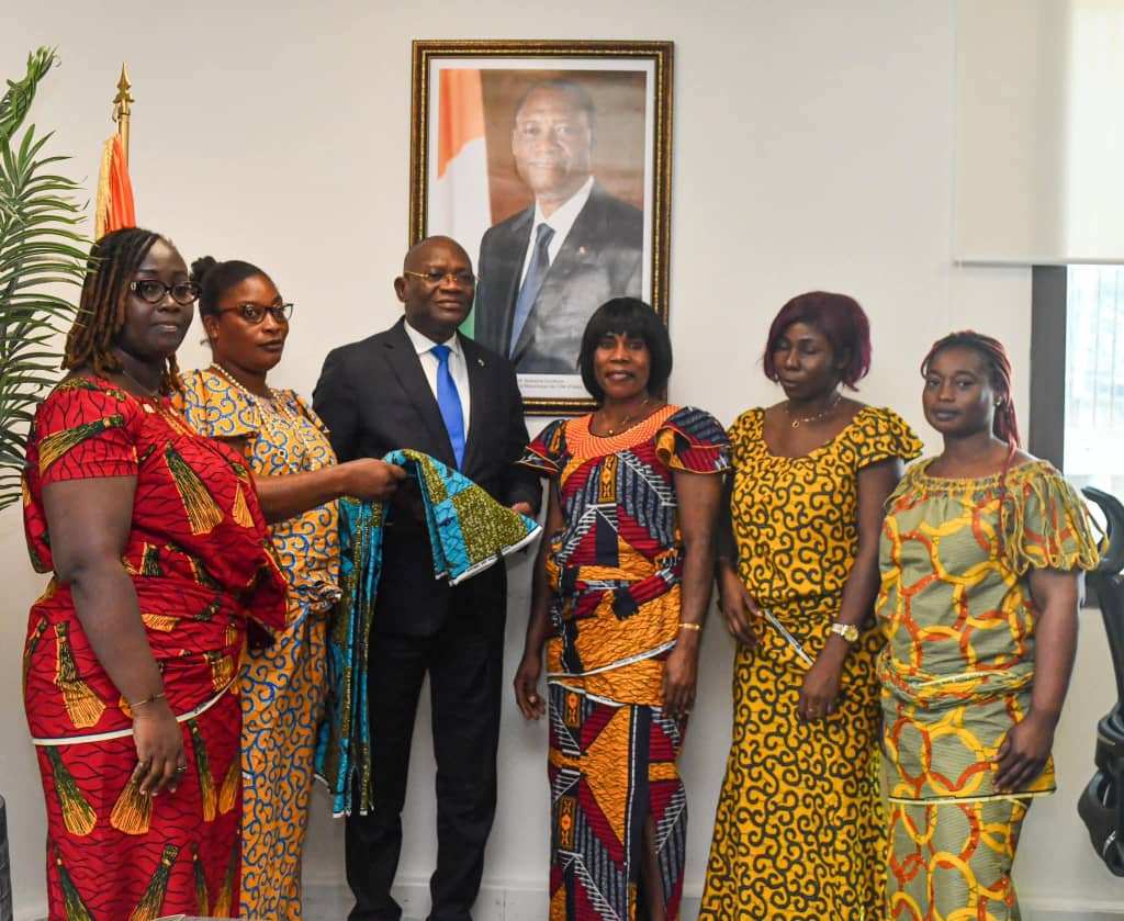 Dans une atmosphère conviviale et empreinte de respect, M. Zahui Cyrille, coordinateur communal de la GENAD, et Mlle Akm Leatitia, présidente de la MUJEFDA, ont conduit leurs délégations respectives au cabinet du Ministre. À cette occasion, elles ont procédé à la remise symbolique d’un présent, initialement prévu lors de la cérémonie d’hommage au Président Alassane Ouattara, organisée par le village d’Akradio.