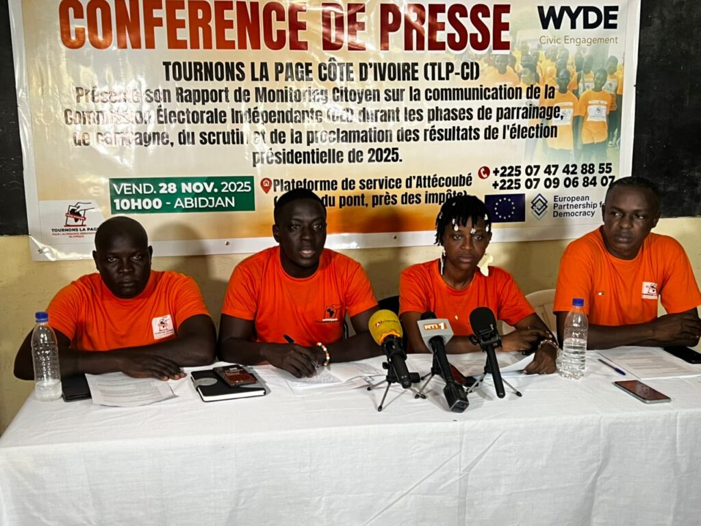 La Coalition Tournons La Page Côte d’Ivoire (TLP-CI) a animé une conférence de presse, le vendredi 28 novembre 2025, à la Plateforme de Service d’Attécoubé, afin de présenter son Rapport de Monitoring Citoyen consacré à la communication de la Commission Électorale Indépendante (CEI). Ce document couvre les phases de parrainage, de campagne, du scrutin et de la proclamation des résultats de l’élection présidentielle d’octobre 2025.