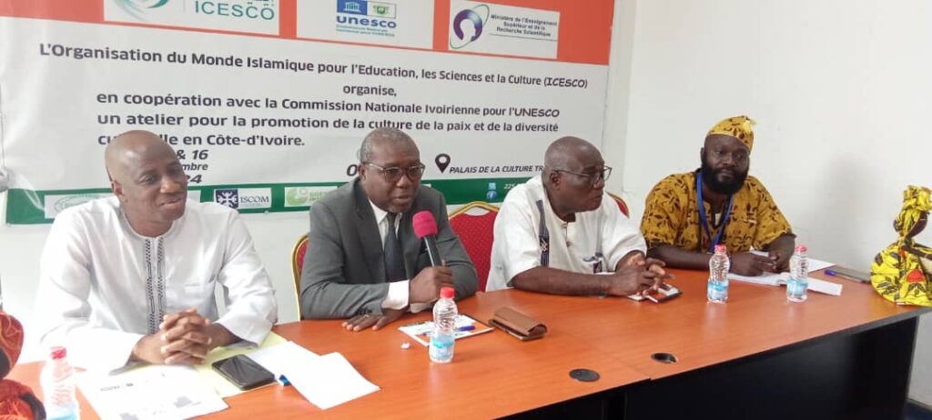 Le Palais de la Culture de Treichville a vibré au rythme de l’unité et du dialogue culturel, les 15 et 16 novembre 2024, avec un atelier initié par l’Organisation du Monde Islamique pour l’Éducation, les Sciences et la Culture (ICESCO). En collaboration avec la Commission Nationale Ivoirienne pour l’UNESCO, Piloté et modéré par le professeur Boni Assié (Enseignant chercheurs et maître des conférences à l’Université FHB de Cocody), cet événement phare, placé sous le thème « Promouvoir la culture de la paix et la diversité culturelle en Côte d’Ivoire », a rassemblé des experts, des décideurs et des acteurs de la société civile pour explorer les solutions adaptées aux défis socioculturels du pays.