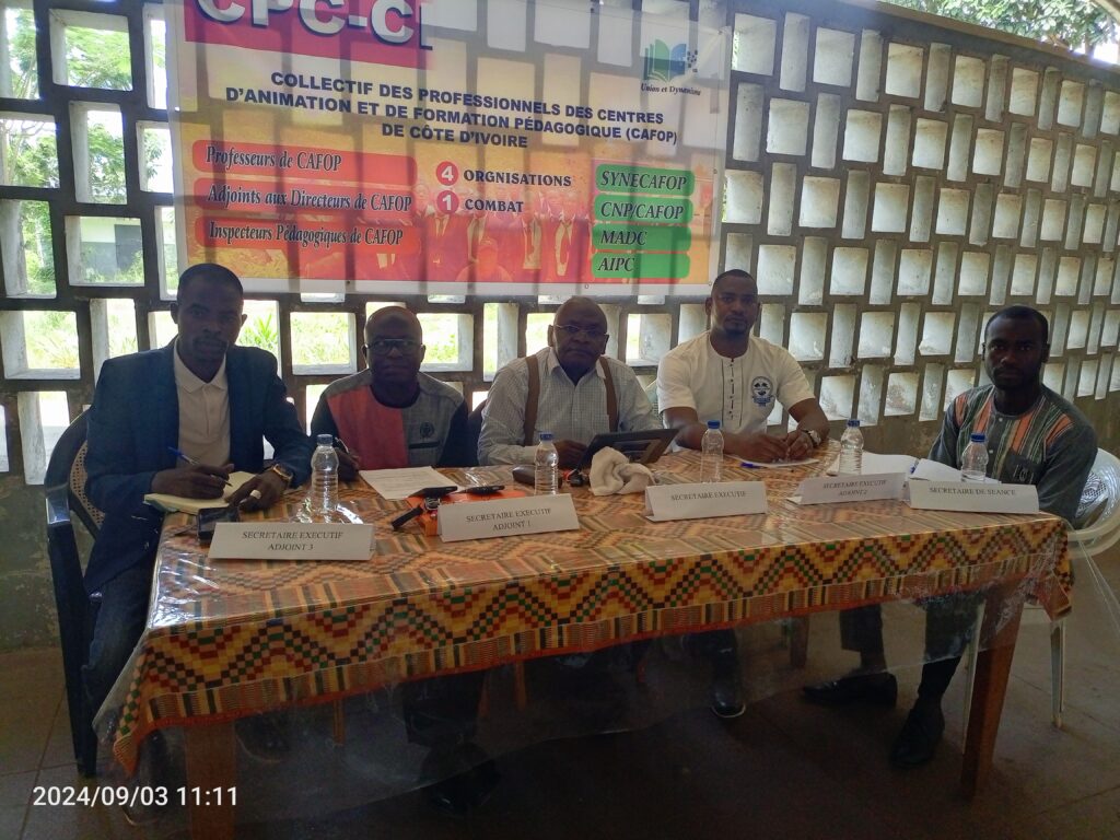 Créé en août 2024, le collectif des professionnels des Centres d’Animation et de Formation Pédagogique dénommé (CPC-CI) et composé des Adjoints aux Directeurs de CAFOP (ADC), des inspecteurs Pédagogiques de CAFOP (IPC) et de Professeurs de CAFOP.