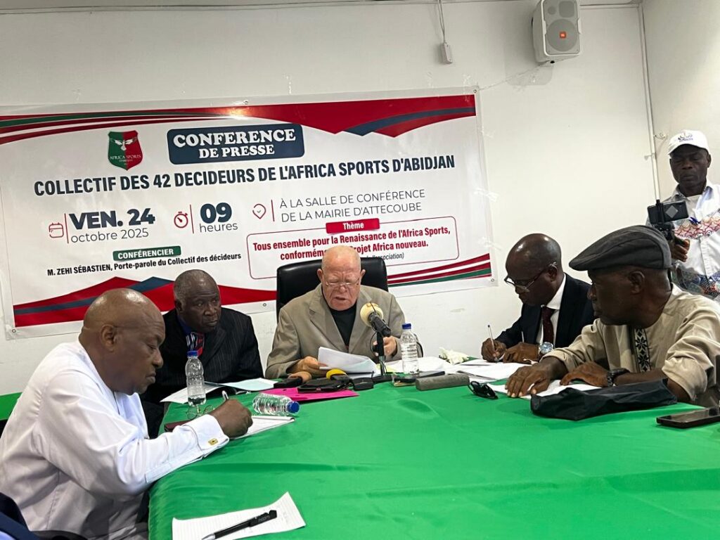 Réunis ce vendredi 24 octobre 2025 à la salle de conférence de la mairie d’Attécoubé, les membres du Collectif des 42 Décideurs de l’Africa Sports d’Abidjan, désormais réduits à 36 après plusieurs décès, ont pris la parole pour exiger une refondation profonde du mythique club vert et rouge.