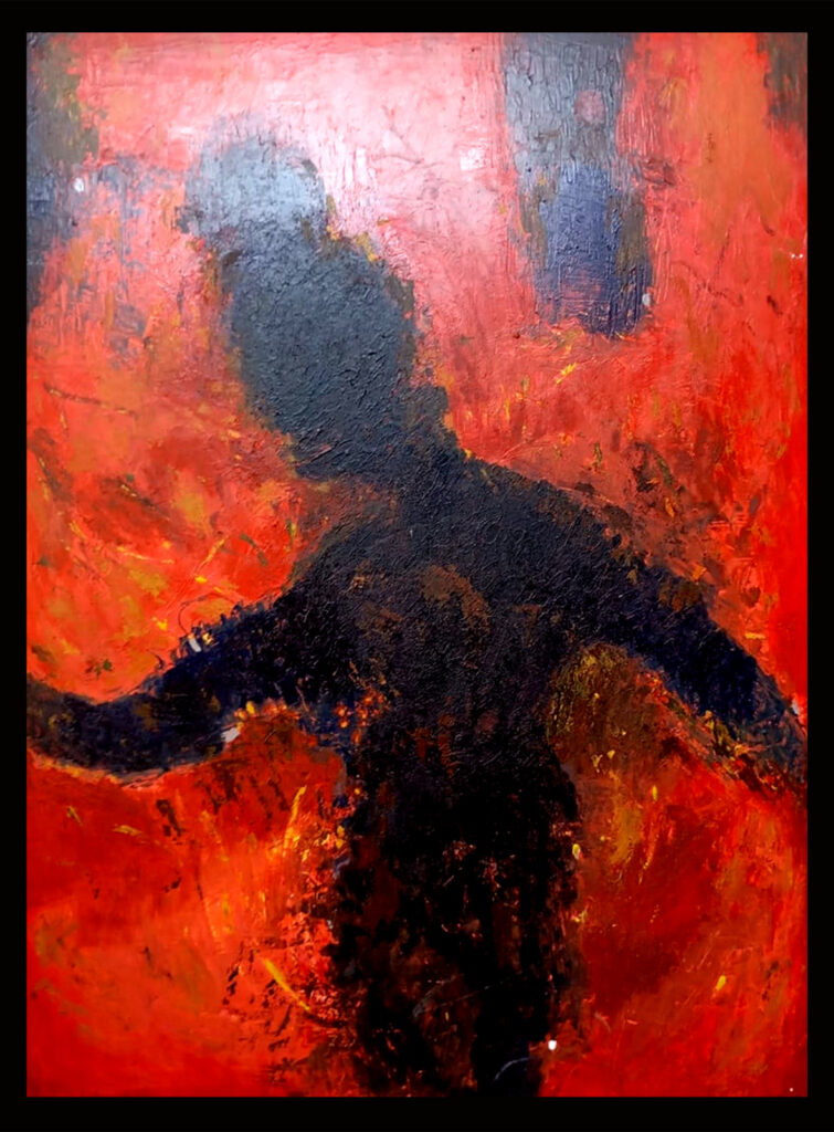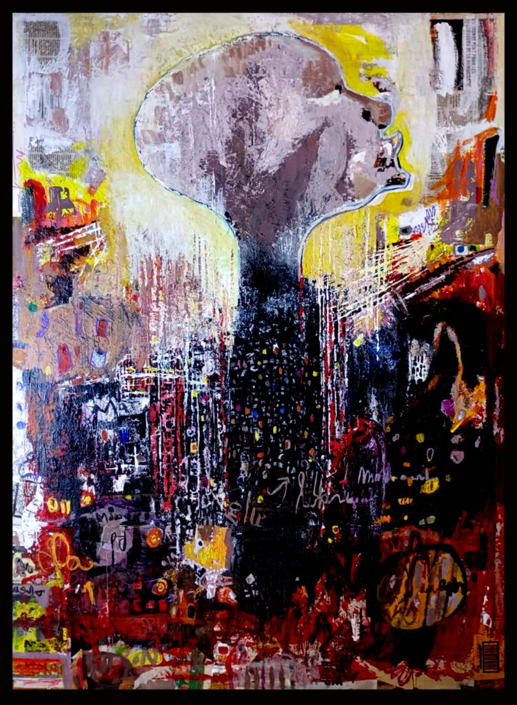 « Ma technique est axée sur les expressions de l’environnement à travers le graphisme des fonds perdus, avec des personnages anonymes qui illustrent ma pensée », explique-t-il.