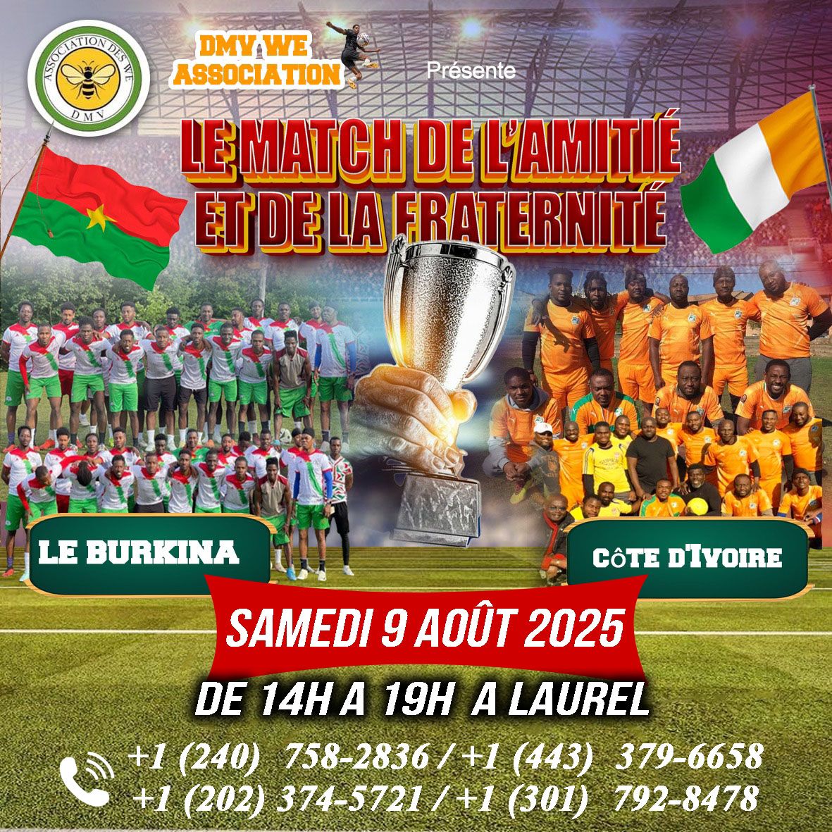 Le samedi 9 août 2025, la ville de Laurel dans l’État du Maryland (États-Unis) vibrera au rythme d’une rencontre pas comme les autres : un match de gala opposera la Côte d’Ivoire au Burkina Faso sur le terrain d’honneur du Alice B. McCullough Field. Organisé par l’association des Wês du District de Columbia, du Maryland et de la Virginie (DMV), cet événement sportif et culturel s’inscrit dans le cadre du renforcement de l’amitié et de la fraternité entre les communautés ivoirienne et burkinabé vivant sur le sol américain.