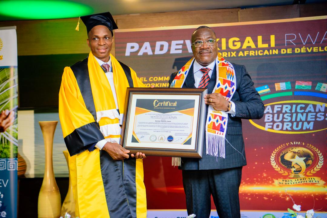 Le parcours de Docteur Jules Konan est jalonné de distinctions prestigieuses. Parmi ses titres les plus notables, on compte le Super Prix Diamant Félix Houphouët-Boigny en 2023 et le Grand Prix International PDW 2024 du meilleur entrepreneur en BTP en Afrique. Il a également été sacré Docteur Honoris Causa par l’Université de Dubaï, un honneur rare pour un Africain.