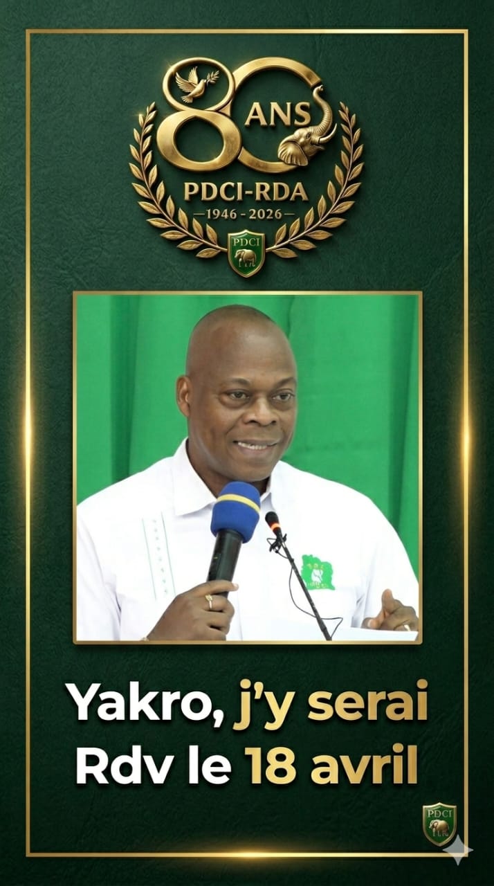 « À l’occasion des 80 ans du PDCI-RDA, j’appelle chaque militant, chaque sympathisant et chaque mouvement à une mobilisation totale. Cet anniversaire est le nôtre : engageons-nous pleinement pour en faire un succès historique, à la hauteur de notre héritage. Tous mobilisés dans l’unité et la détermination ».