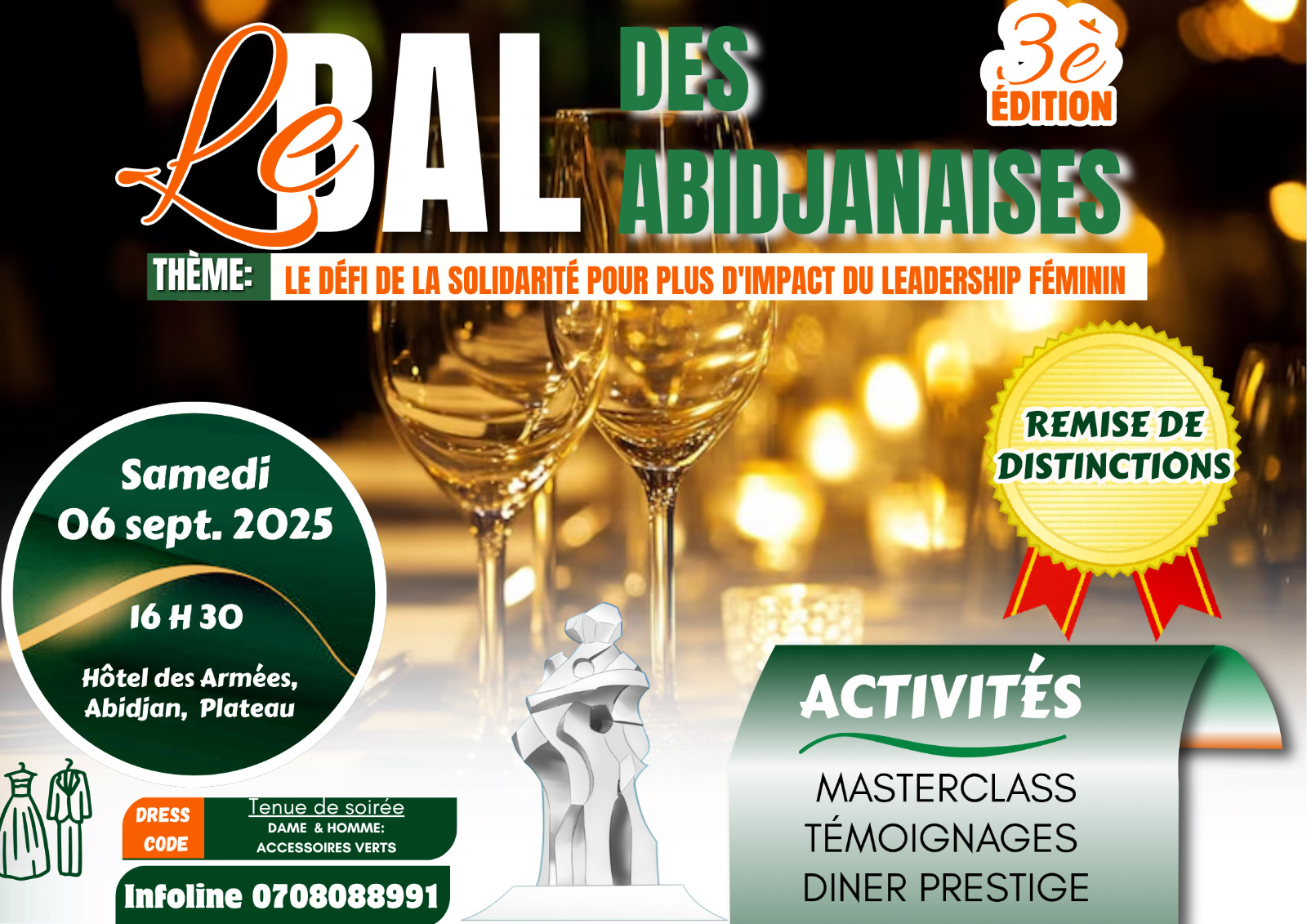 Après deux éditions couronnées de succès, le Bal des Abidjanaises organisé par Madame THERESE AMICHIA représentante du Cercle des Solidarités Francophones en partenariat avec l’entreprise ACLAM signe son grand retour pour une troisième édition, plus ambitieuse, élégante et inspirante. Le Rendez-vous est donné le samedi 6 septembre 2025, de 16h30 à 20h30, dans le cadre raffiné de l’Hôtel des Armées, pour un événement qui conjugue glamour, réseautage et engagement social.