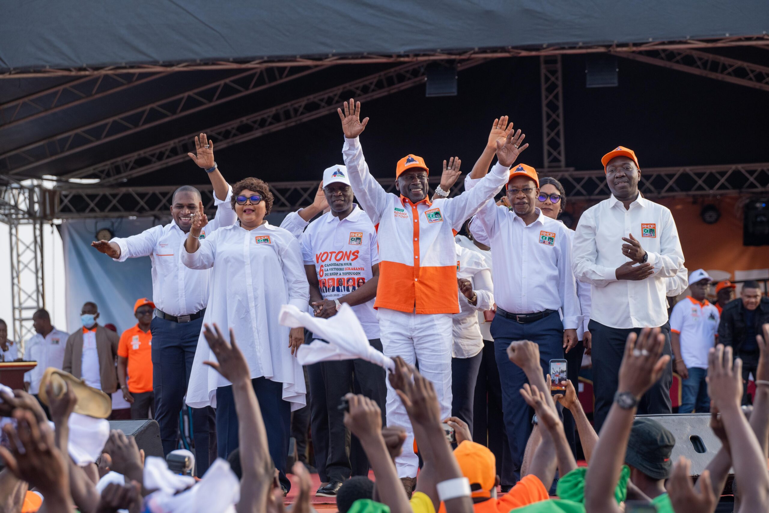 Dès les premières heures de l’après-midi, des milliers de militants et sympathisants ont convergé vers la place Ficgayo, drapés de tee-shirts, casquettes et banderoles aux couleurs du RHDP. Chants, slogans et ovations ont rythmé cette mobilisation impressionnante, traduisant l’enthousiasme d’une base militante déterminée à porter la liste conduite par Adama Bictogo à la victoire.
