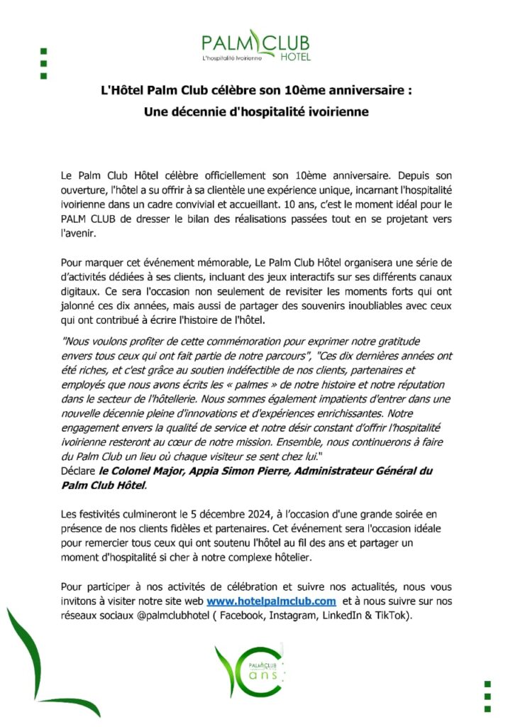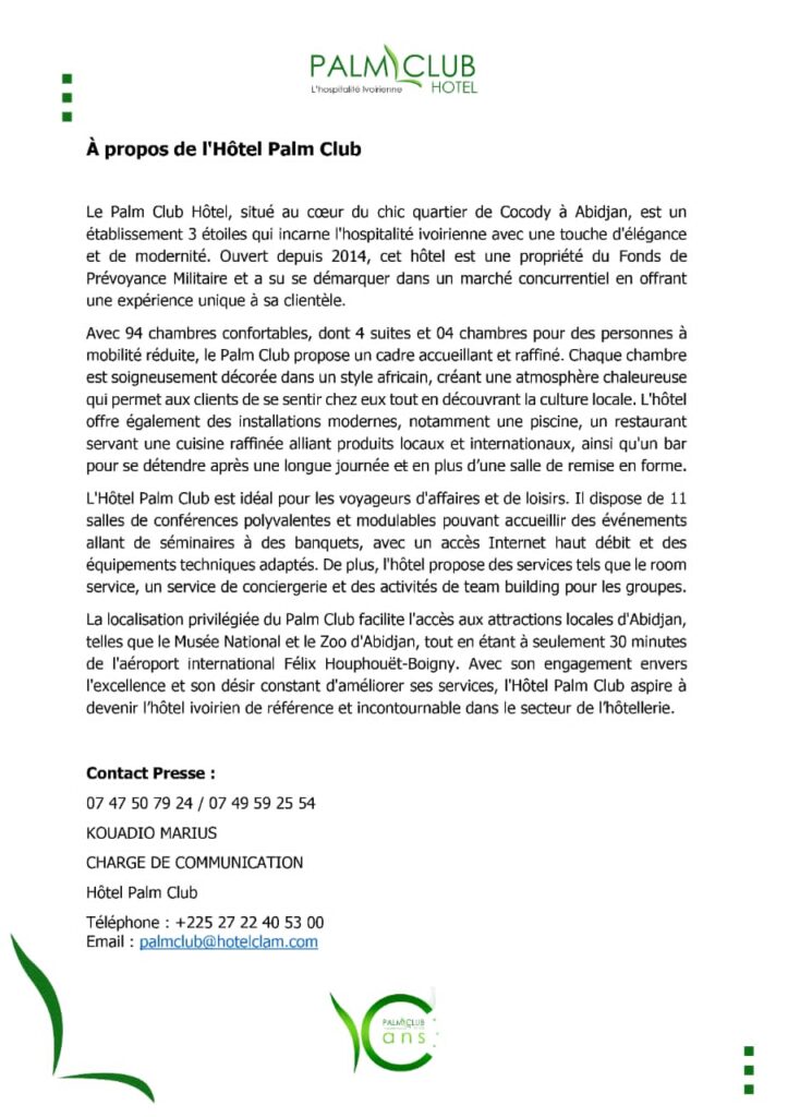 Situé au cœur du quartier chic de Cocody à Abidjan, l’Hôtel Palm Club célèbre avec fierté son 10ème anniversaire. Cet établissement, ouvert en 2014, a su s’imposer comme une référence dans le secteur de l’hôtellerie ivoirienne grâce à son engagement envers l’hospitalité, la qualité de service et le confort de ses clients.
