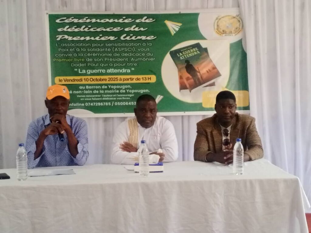 L’Association pour la Sensibilisation à la Paix et à la Solidarité (ASPSCI) a organisé, le vendredi 10 octobre 2025, au Barron, dans un quartier de Yopougon, la cérémonie de dédicace du premier ouvrage de son président et aumônier, Dodet Paul, intitulé « La guerre attendra ».