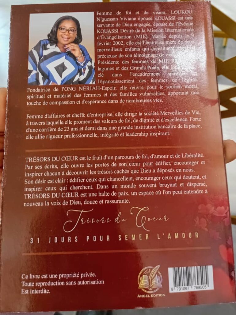 A travers cette œuvre, Mme Kouassi ouvre les portes de son cœur pour édifier, encourager et inspirer chacun à découvrir les trésors cachés que Dieu a déposés en nous.
