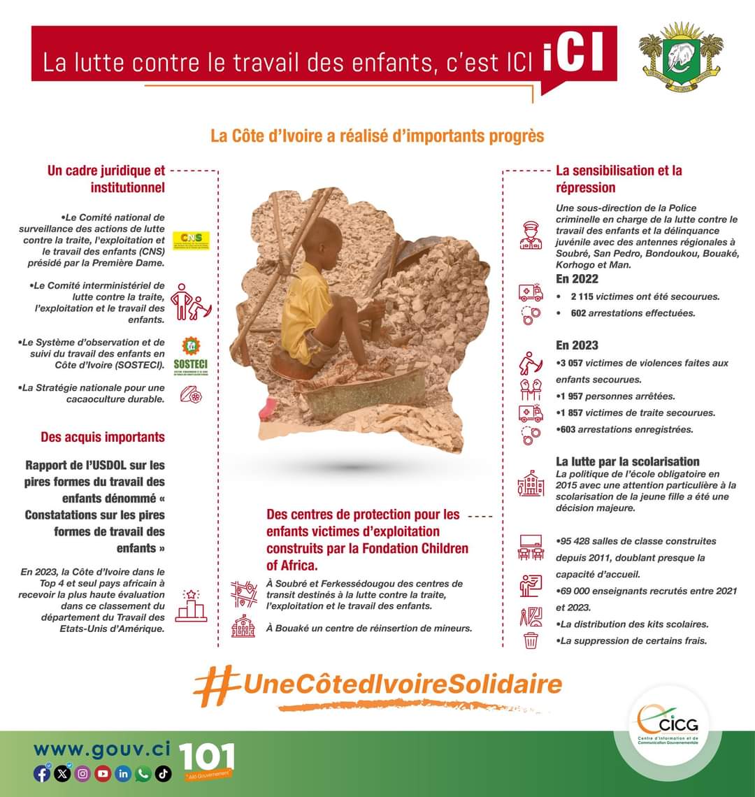 Toutes ces actions valent à la Côte d’Ivoire d’être régulièrement classée dans le rapport de l’USDOL, parmi les pays qui progressent dans la lutte contre le travail des enfants. L’objectif étant la prévention et la protection des enfants afin d’arriver à l’éradication définitive du phénomène.
