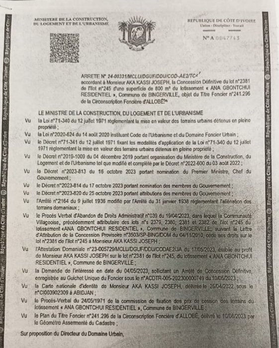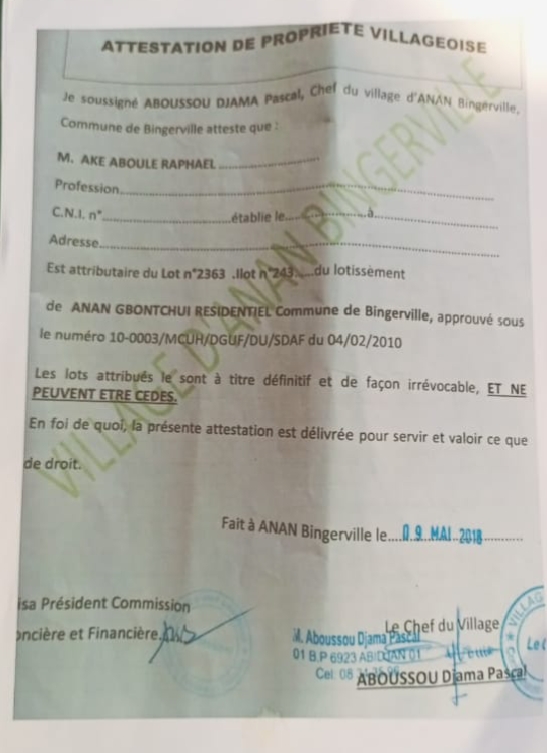 C’est dans ce contexte que tous les Djehous, les Dogbas, les Agbans et les Assoukrous ont reçu leur terrain. Mais il est fort de constater depuis plusieurs mois qu’au ministère de la construction l’on nous informe que nous avons été dépossédés de ces terres et que certains ont été déjà vendu.