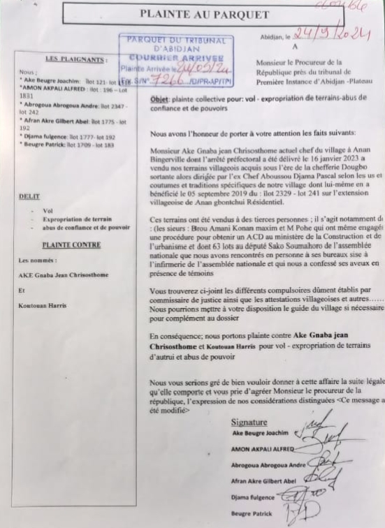 En effet, il sait que nous sommes informés par l’administration que c’est lui qui a signé les abandons de droits sur nos terrains sans nos consentements afin de les vendre. Il a mis nos lots en acquisition alors que son arrêté préfectoral lui donnant le droit de mener de telles actions ne lui était délivré. C’est de façon illégale qu’il a agi », a expliqué Amon Couthouan Alain avec le concours de ses compaires de la table de séance, Beli Honoré et Alia Apollinaire, Ce, soulignant que le chef Aké Gnaba Jean avait commencé à délivrer des terrains en 2022 alors que son arrêté préfectoral est arrivé en janvier 2023.