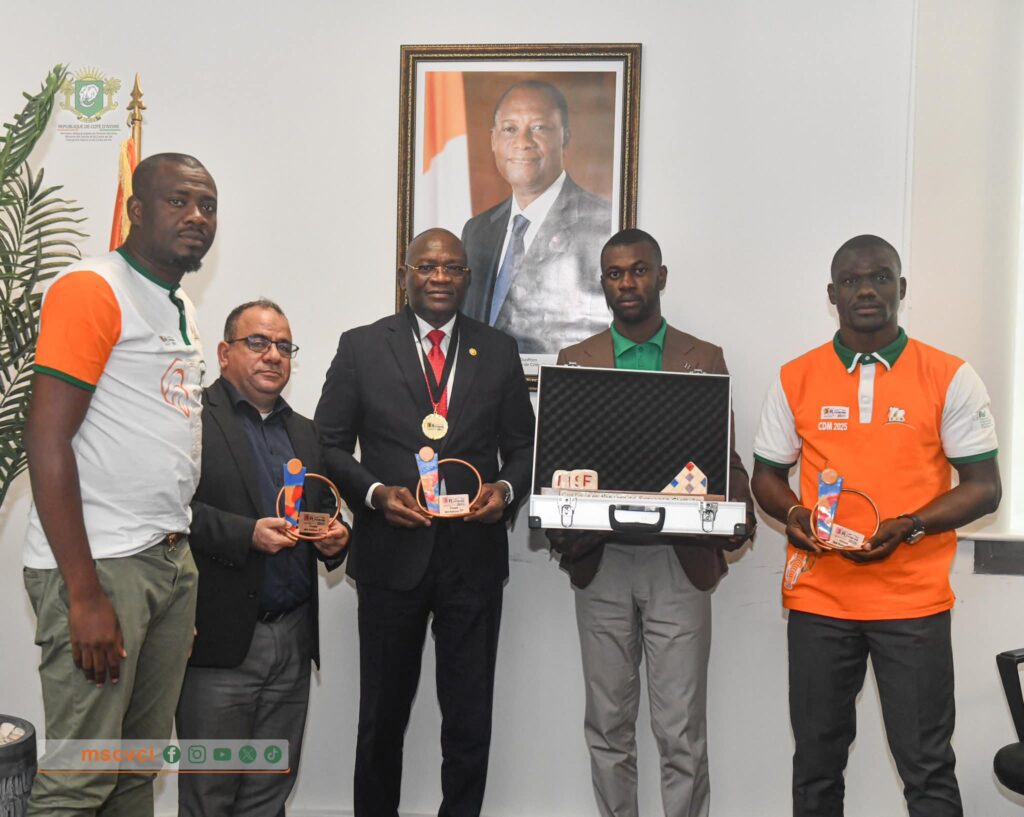 Un véritable exploit pour la Côte d’Ivoire. Ce jeudi 14 août 2025, le Ministre délégué en charge des Sports et du Cadre de Vie, M. Adje Silas METCH , a reçu à son Cabinet les Éléphants Scrabbleurs, triple champions du monde en titre après un dernier sacre aux Championnats du monde en juillet dernier au Québec.