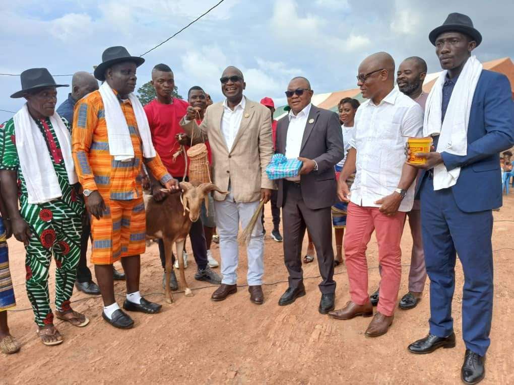 Les envoyés de Mamadou Diawara, les honorables Abdoulaye Karim Diomandé et Kra Paulin, ont fait un don de plus de trois millions aux populations.Touché par l’approche du Groupe Parlementaire RHDP, Ziahé, le porte-parole des cadres, a non seulement exprimé sa profonde gratitude au parrain et à son représentant, mais il leur a aussi adressé ses vifs remerciements pour avoir honoré son village, sans oublier de faire quelques doléances. « Je suis animé d’une grande joie. La joie de savoir que je ne suis pas seul, malgré la distance entre Tabou et Abidjan. J’ai la présence du groupe parlementaire RHDP. Le thème de cette journée est de promouvoir un pan de notre culture, qui est la cérémonie du cola. Je sors totalement satisfait parce que le message transmis par le parrain est empreint de paix et de cohésion, surtout que nous sommes dans un village frontalier. Nous avons certes besoin de développement, mais aucun développement ne peut se faire quand il y a du bruit. Donc, je pars très satisfait de la mobilisation des parents et de tous les dons qui ont été faits à leur endroit. Leur présence a suscité beaucoup d’espoir car ils sont venus avec leur cœur et l’envie de nous écouter. Je sais que notre doléance sera transmise à qui de droit », a-t-il supplié.