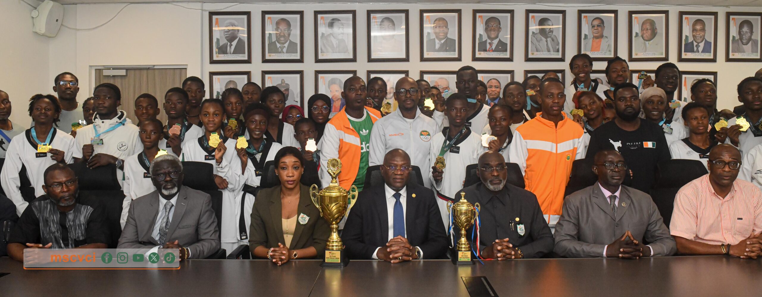 Abuja, la capitale nigériane sera pendant longtemps associée à la réussite des taekwondoistes ivoiriens. En compétition lors des Championnats d’Afrique du 21 au 25 aout, la Côte d’Ivoire a remporté 33 médailles dont 15 en Or. Ce lundi 25 aout 2025, le Ministre délégué Adje Silas METCH , patron du sport ivoirien, a reçu à son Cabinet, l’ensemble de la délégation (officiels, athlètes et entraineurs), venus présenter l’ensemble des trophées et médailles remportés lors de la compétition.